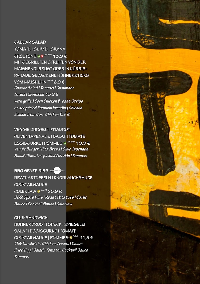 For those craving something more substantial, the Rumpfsteak offers a robust and savory flavor, while the Salmon dish brings a delicate, yet rich taste of the sea. The Cheeseburger is another hearty option, perfect for a satisfying meal. Additionally, the BBQ Brunch is an excellent choice for those looking to enjoy a mix of flavors in a relaxed, brunch-style setting.